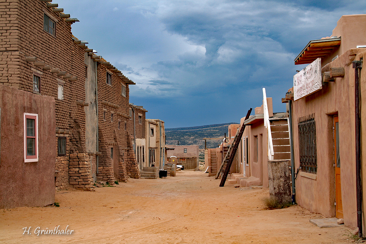 Heute nennt sich der Acoma Pueblo stolz »Sky City«, und genau wie die Hopis in Old Oraibi behaupten die Acoma, dass er seit Mitte des 12. Jahrhunderts dauerhaft besiedelt und damit die älteste Ansiedlung Nordamerikas wäre. Ganz unbestritten liegt Sky City dramatisch auf einer Mesa, eingerahmt von bizarren, farbigen Felsformationen. Diese fotogene Lage verhalf den Acoma zu einer glatten, bequemen Teerstraße zum Pueblo hinauf, die von einer Filmgesellschaft bezahlt wurde. Bereits zu Stummfilmtagen wurde hier gedreht, und natürlich benützte auch der legendäre John Ford, die Gegend als Naturkulisse.